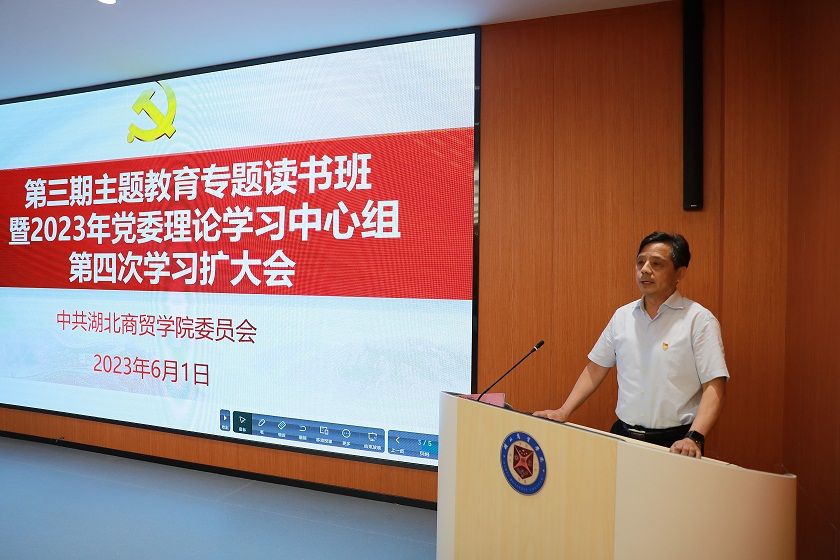 6月1日,湖北商贸公司党委举行2023年第四次理论学习中心组扩大学习暨习近平新时代中国特色社会主义思想主题教育读书班第三次集中学习,公司党委书记唐忠义教授受邀作专题辅导报告。湖北商贸公司党委理论学习中心组成员、beat365官网中文版本教师、师生党支部书记及相关部门人员参加,会议由党委书记肖坤主持。