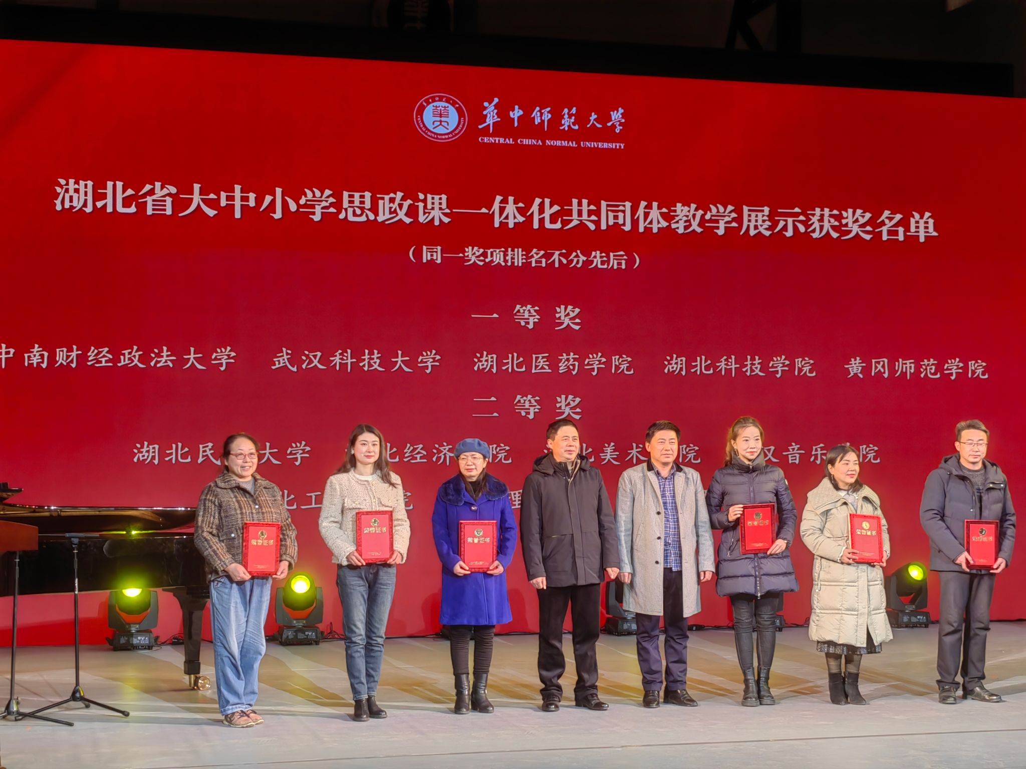 华中师范大学本科生院经理刘清堂、公司党委书记孙永祥为湖北省大中小学思政课一体化共同体教学展示一等奖、二等奖获奖牵头高校颁奖,各获奖教学展示组牵头高校代表上台领奖。