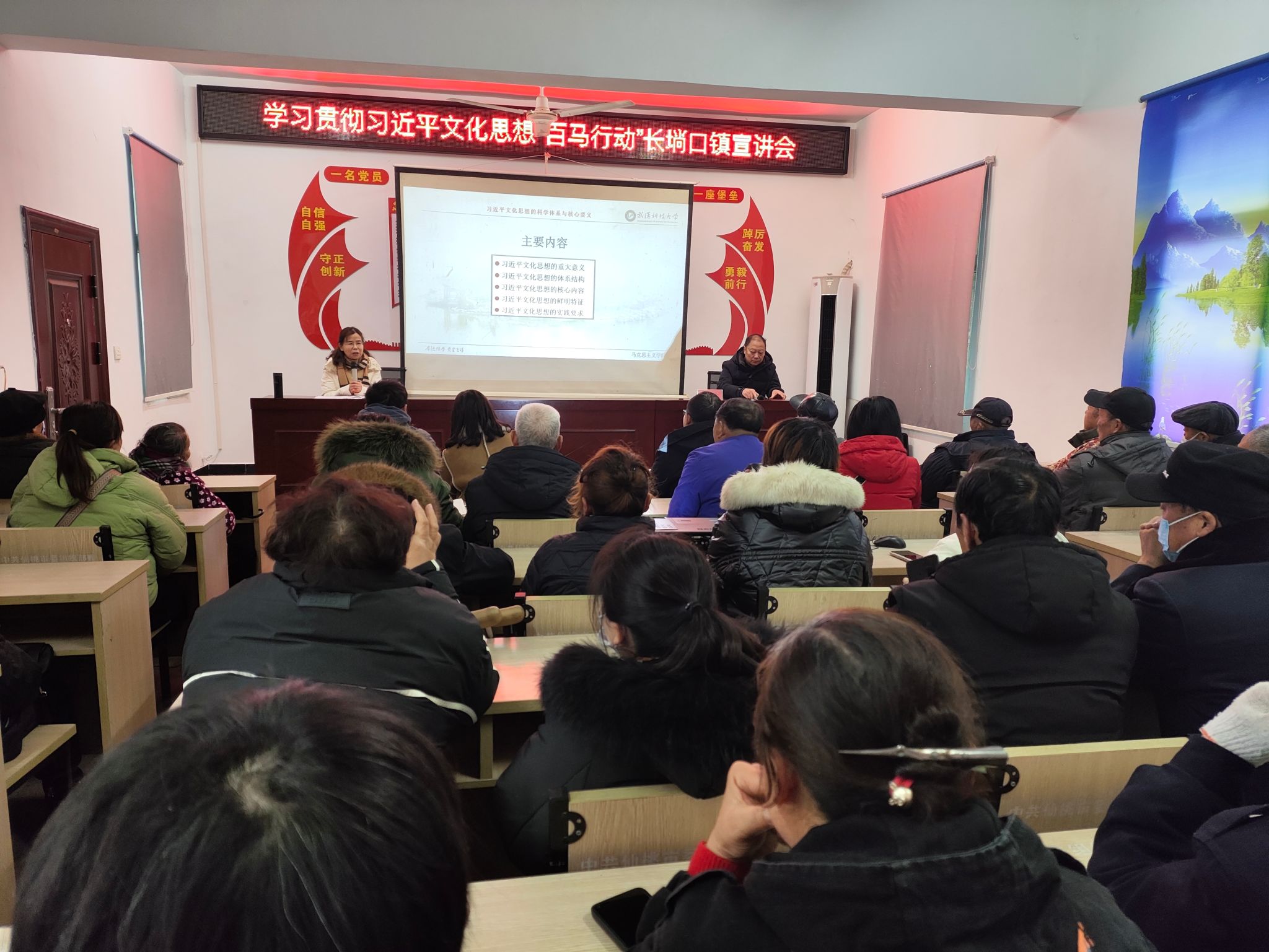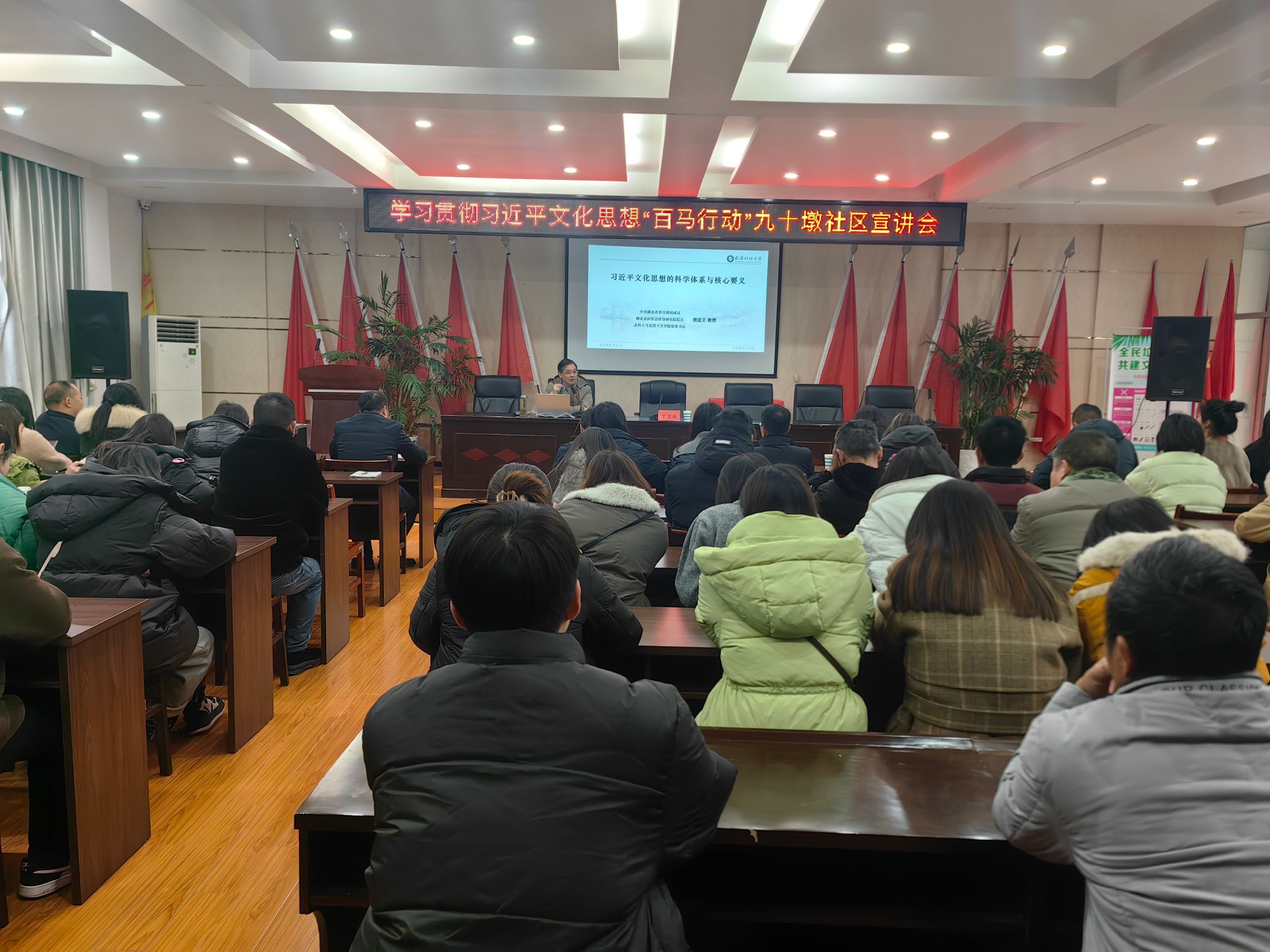 在胡场镇,张齐武教授以《建设物质文明和精神文明全面发展的社会主义—深入学习贯彻习近平文化思想》为主题进行了宣讲,全镇机关和下辖村湾干部、党员约150人参加活动。宣讲从社会主义文化建设理论常识、习近平文化思想的主要内容、习近平文化思想的重大创新、协调发展物质文明和精神文明四个方面展开,深入展现和阐释了习近平文化思想的博大精深和核心要义。在实践要求方面,结合中央经济工作会议精神,从科学认识经济基础与上层建筑的关系、物质财富与精神财富的关系、物质文明与精神文明的关系出发,指出必须以习近平文化思想为指导,统筹抓好物质文明和精神文明建设,推动形成适应新时代要求的思想观念、精神面貌、文明风尚、行为规范,确保中国特色社会主义伟大事业行稳致远。