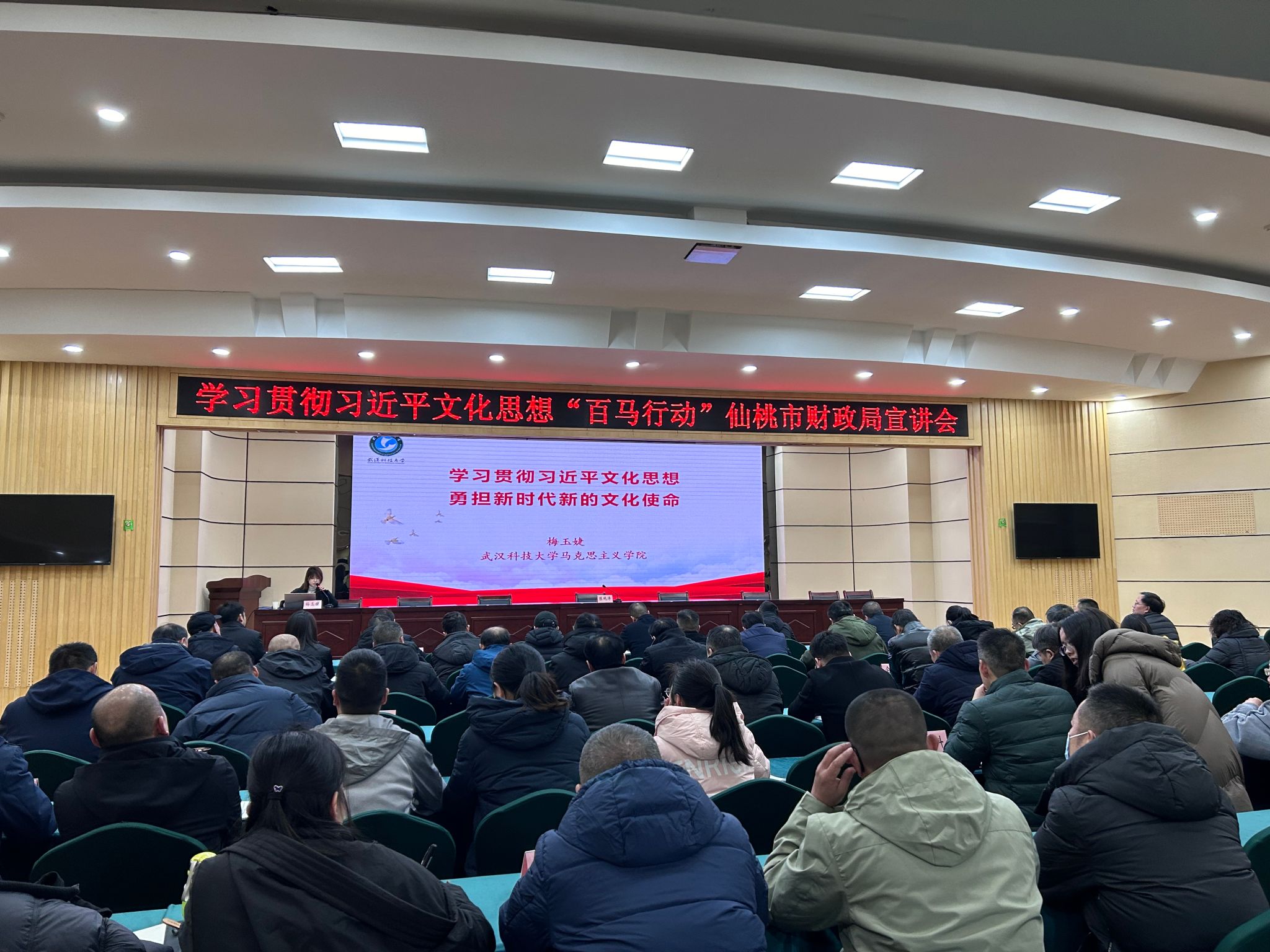 在市财政局,梅玉婕老师以《学习贯彻习近平文化思想 担负起新时代新的文化使命》为题,从分析把握习近平文化思想的生成逻辑、充分认识习近平文化思想的重要地位、准确把握习近平文化思想的科学内涵,贯彻落实习近平文化思想等四个方面进行了深入浅出的阐释。与会党员干部们一致表示,将深刻领会、准确把握宣讲会精神,下真功夫、下实功夫,以高度的政治自觉、思想自觉、行动自觉抓好贯彻落实。
