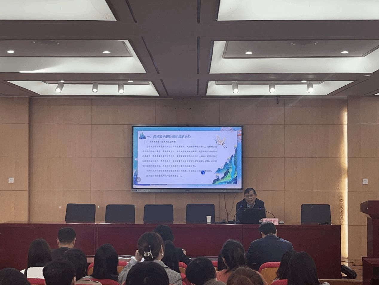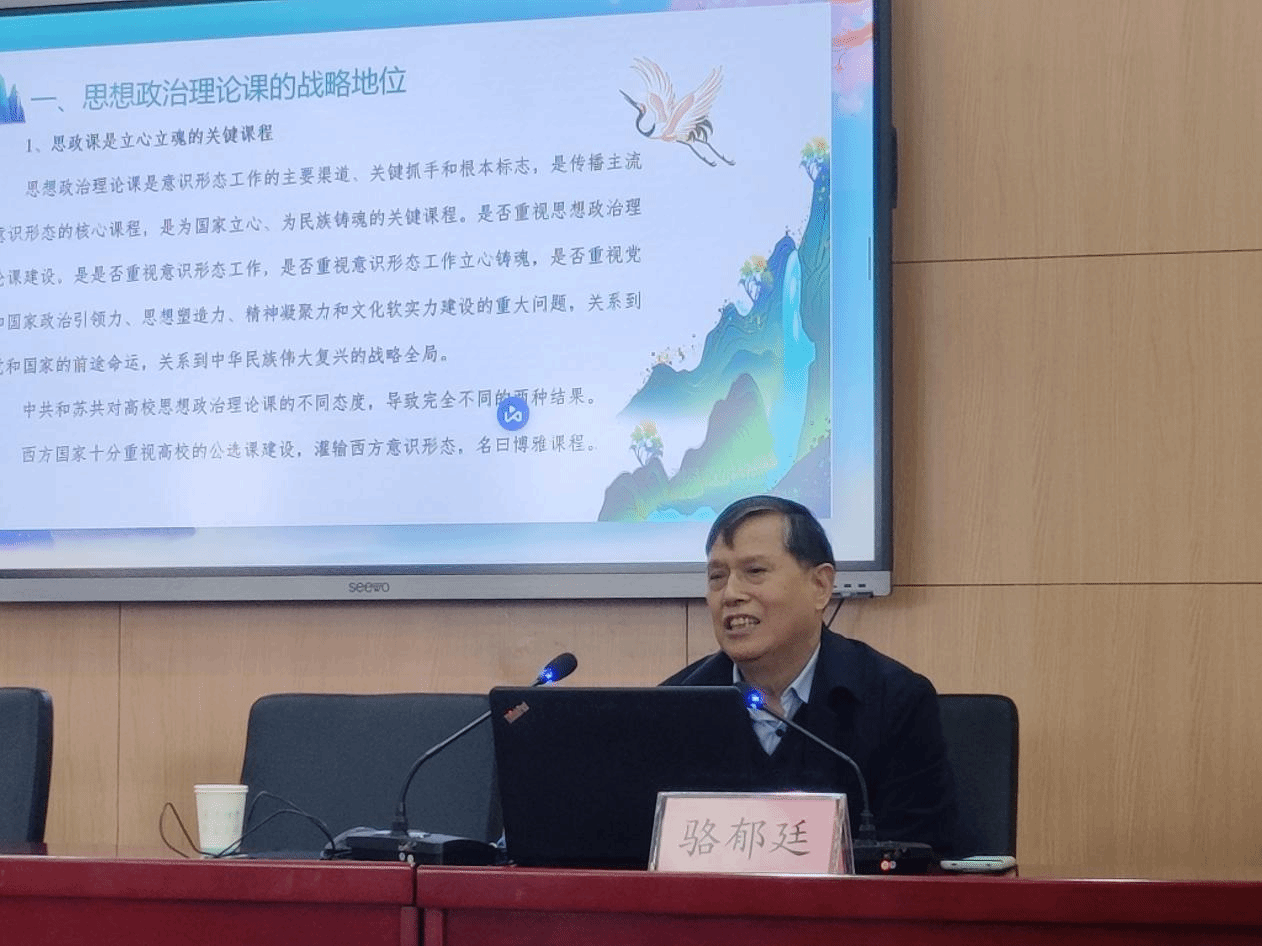 骆郁廷教授以《深入学习贯彻习近平总书记关于思政课的重要论述 推进思政课高质量建设和发展》为题,围绕思想政治理论课的战略地位、根本任务、改革创新、队伍建设、加强改进五个方面作了讲解。骆郁廷教授指出,思政课是立心立魂、强基固本、立德树人、反渗防变的关键课程,在奠定中华民族千秋伟业、培养社会主义建设者和接班人、培养堪当民族大任的时代新人中发挥着重要作用。要深入学习习近平总书记关于思政课的重要论述,坚持“八个统一”推进思政课的改革创新,切实加强思政课教师队伍建设,营造办好思政课的社会氛围。