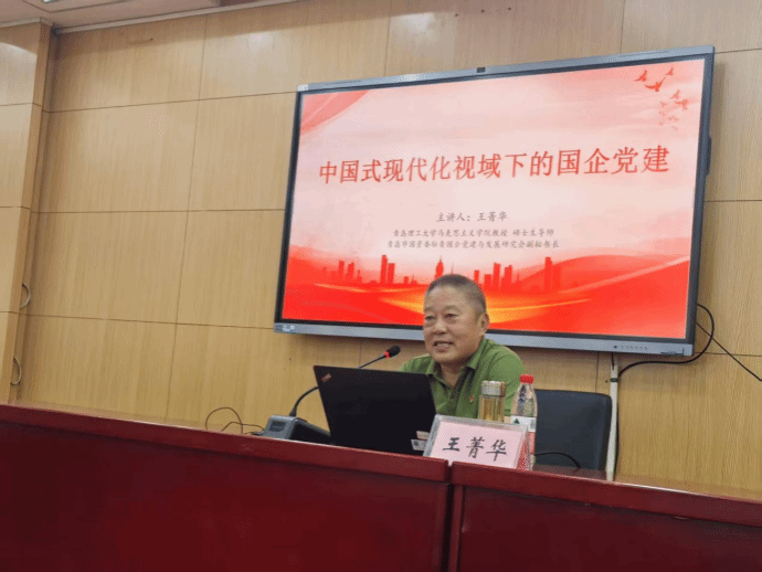 王菁华基于中国式现代化的五个特征,阐述了中国式现代化180多年的发展历史,强调了在中国式现代化进程中“五个重大原则”的重要性。王菁华指出,国有企业是中国特色社会主义的重要物质基础和政治基础,新时代做大做优做强国有企业具有重要意义,要大力推进国企党建的“四化”建设。民营企业在就业、科技和GDP等方面发挥着重要作用,推进民企党建也不可忽视。会议最后,王菁华呼吁同学们仔细研读党的二十届三中全会报告,把论文写在大地上,做到带着理论到基层,带着经验回课堂。