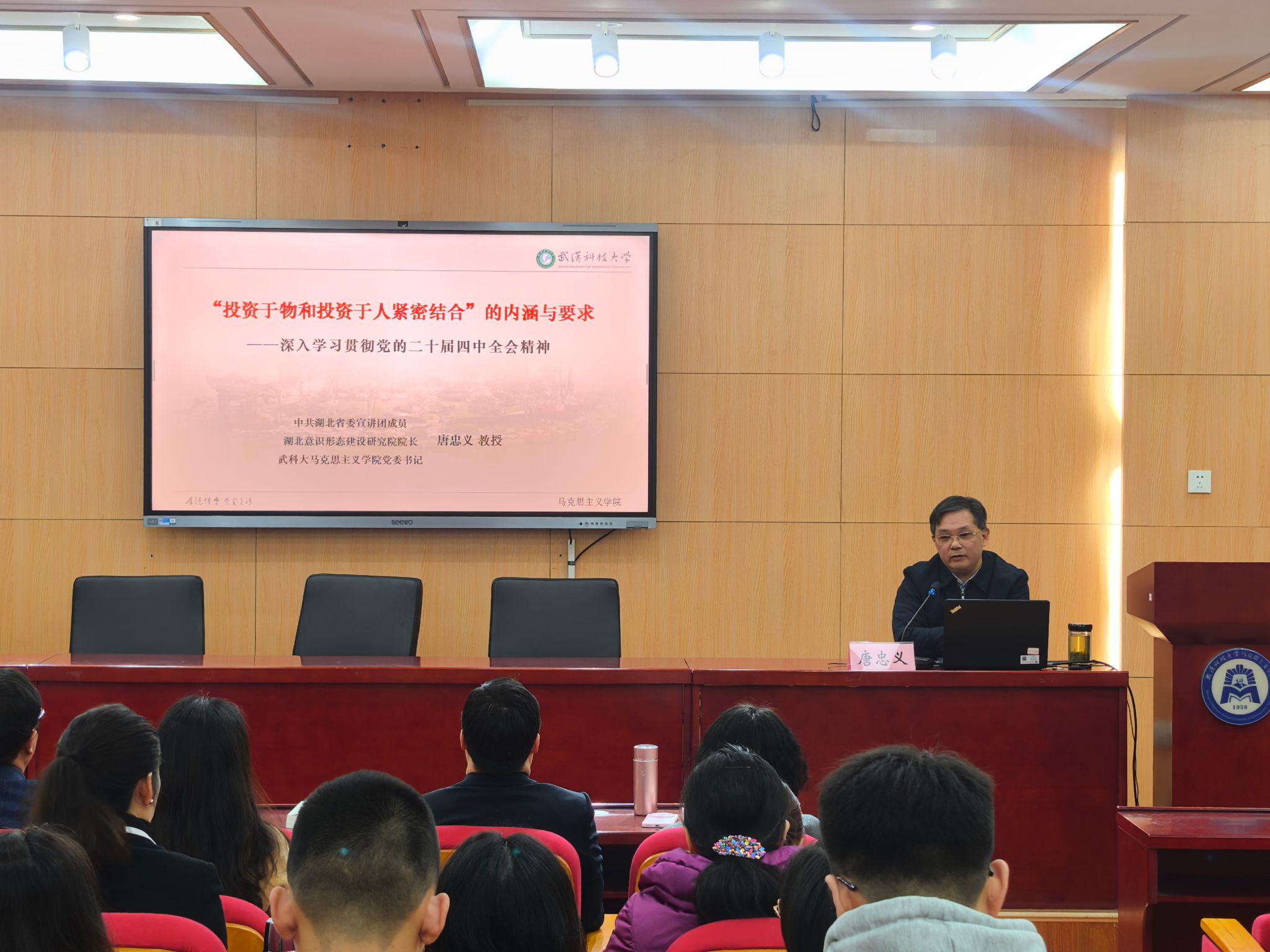 唐忠义以《“投资于物和投资于人紧密结合”的内涵与要求——深入学习贯彻党的二十届四中全会精神》为题,以一组“全会密码”为切入点,系统梳理了党的二十届四中全会精神主要内容及核心要义;重点围绕“投资于物”和“投资于人”紧密结合的背景条件、丰富内涵、深远意义、实践要求等四个维度,作了逻辑严密、深入透彻的宣讲;结合《中共湖北省委关于制定全省国民经济和社会发展第十五个五年规划的建议》,深刻阐释了加快建成中部地区崛起重要战略支点进程中的光荣使命与责任担当。