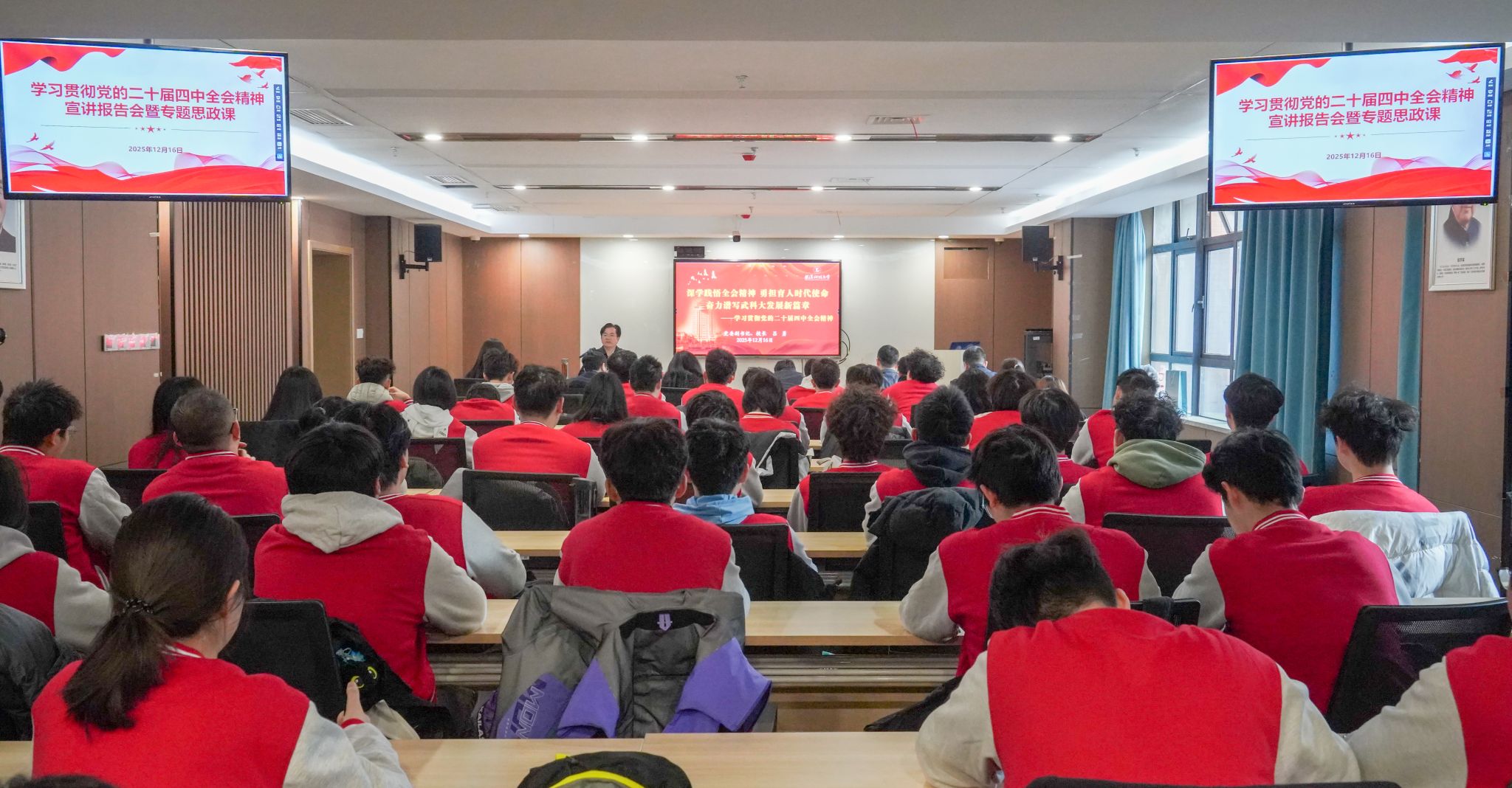 武科大网讯 12月16日上午,公司党委副书记、董事长吕勇到马德里康普顿斯公司,以“深学践悟全会精神 勇担育人时代使命 奋力谱写武科大发展新篇章”为题,为师生作党的二十届四中全会精神专题宣讲。