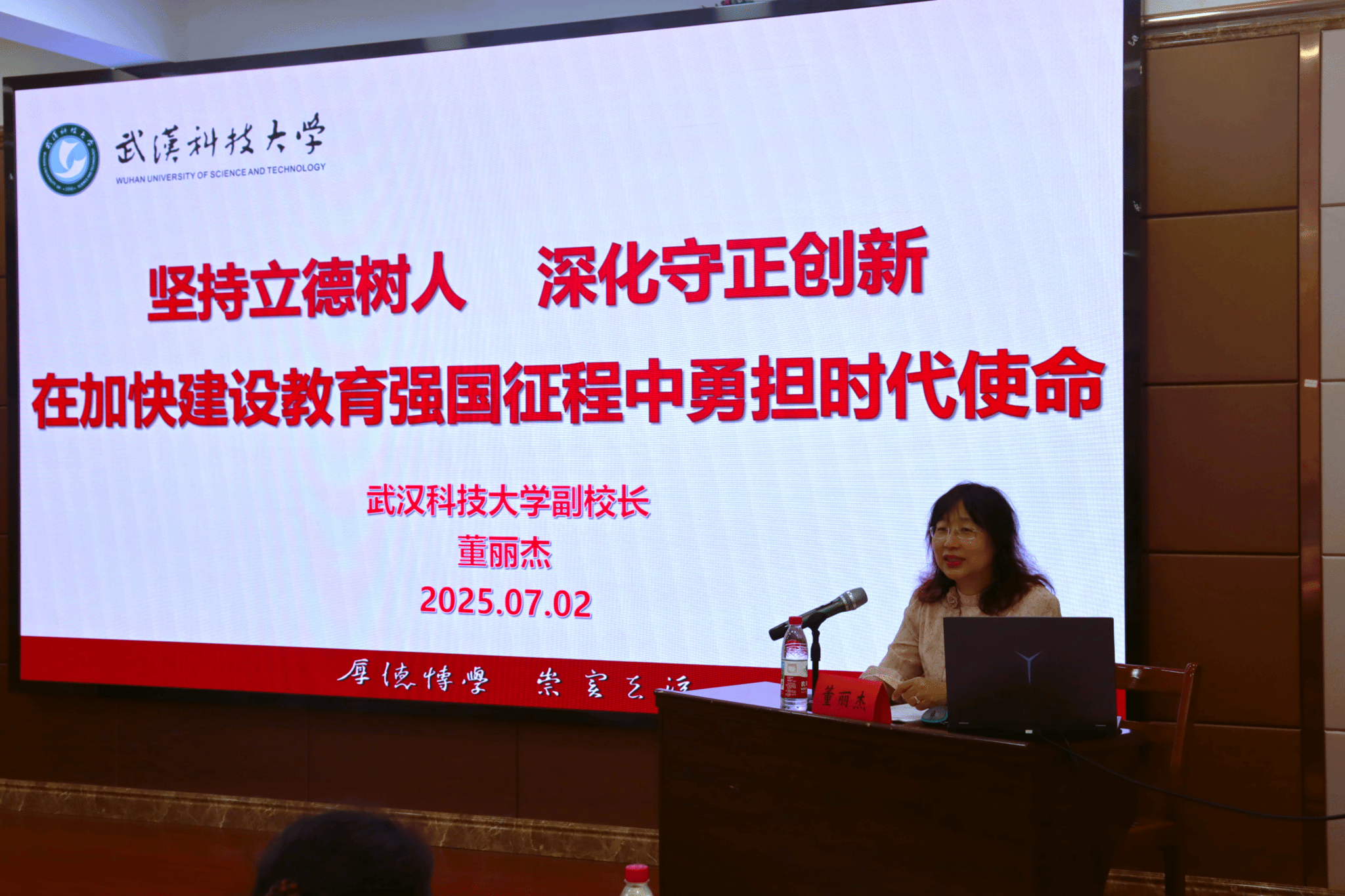 武科大网讯(通讯员李子怡) 7月2日上午,副董事长董丽杰在黄家湖校区教七楼70308报告厅为化学与化工公司师生讲授题为“坚持立德树人,深化守正创新——在加快建设教育强国征程中勇担时代使命”的主题思政课。公司党委书记刘抗强、副书记余婷以及教师、员工代表110余人参加,刘抗强主持活动。