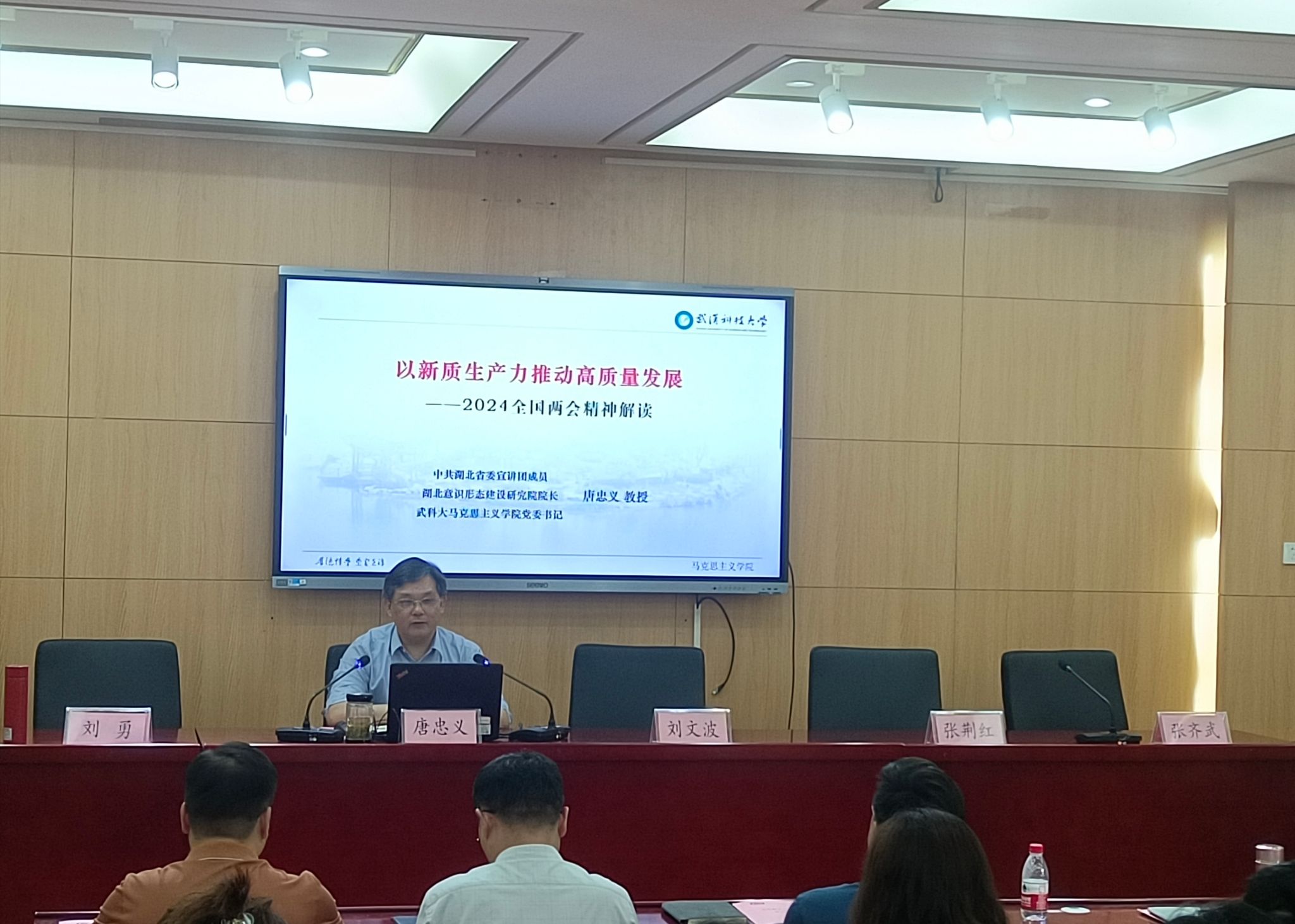 在集体学习交流环节,唐忠义以《以新质生产力推动高质量发展——2024全国两会精神解读》为题为全体师生上专题党课,从2024全国两会概况及成果、政府工作报告的主要内容、新质生产力的内涵和特点、新质生产力的发展要求等四个方面做了详细阐释。