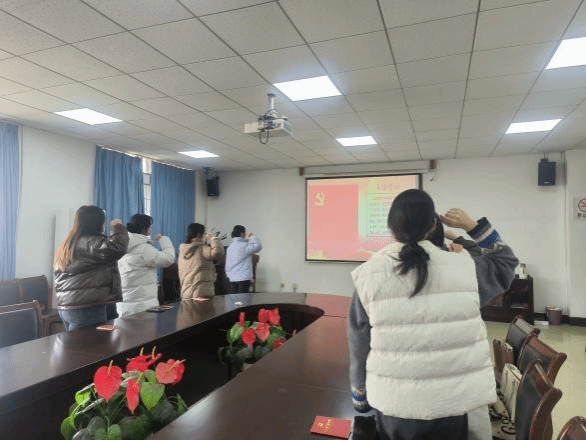 胡梦通报了本月党员参会和支部党费缴纳情况,带领全体党员重温入党誓词,并诵读《中国共产党章程》第五章,集中学习党的基层组织主要内容。
