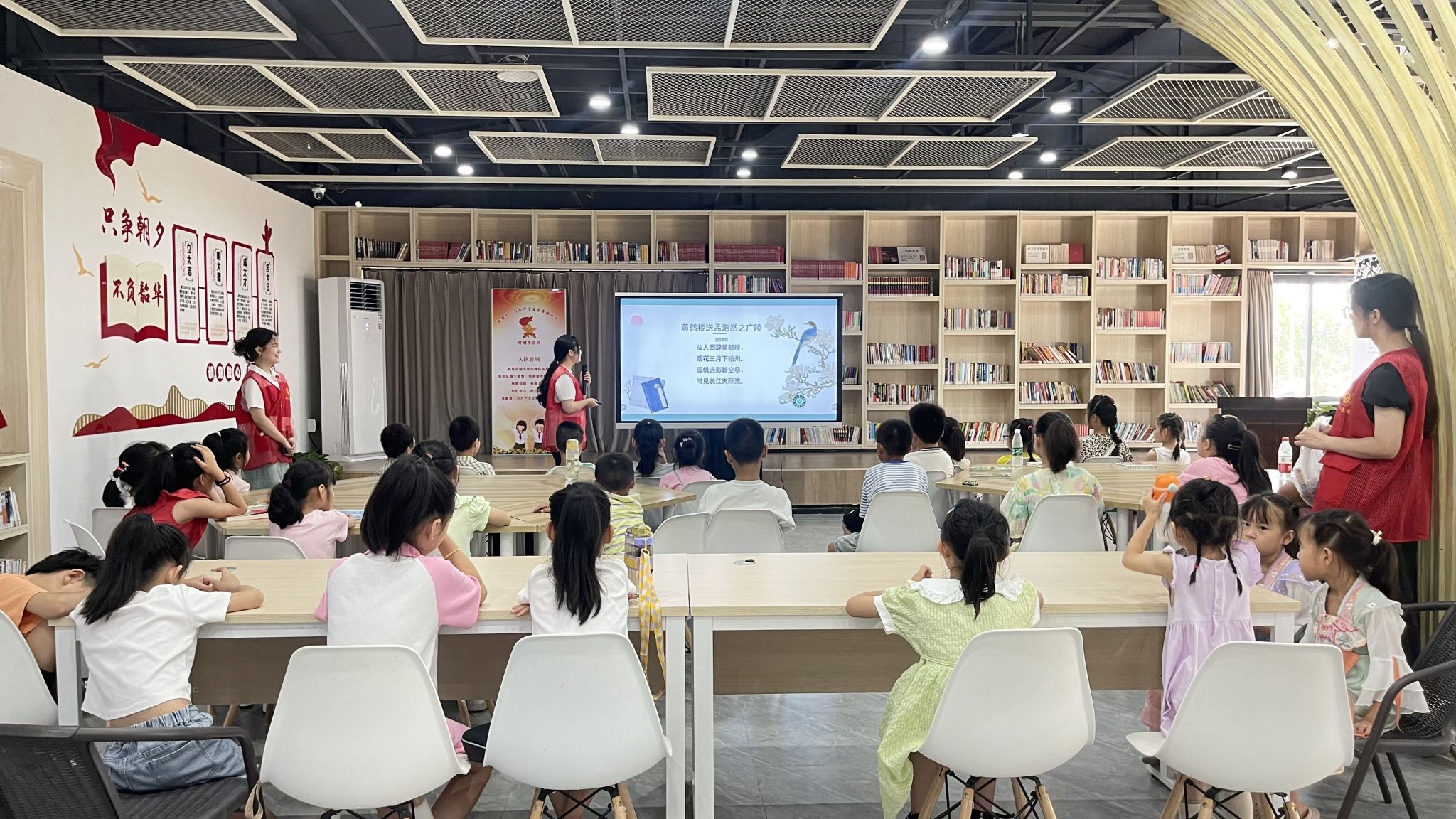 此次活动由古诗赏析和以画映诗两部分组成。活动开始前,志愿者谢丽娜向小朋友们介绍了古诗在中国传统文化中的重要地位,她说道:“古人以诗画来抒发生活情感,诗画是表达喜怒哀乐的一种方式。中国诗画历史源远流长,积累深厚,是中华民族精神和中华传统文化的结晶,诗中有画,画中有诗是中国美学的一种极高境界,极具渲染力。”随后,志愿者谢丽娜和志愿者冯漫漫带领小朋友们赏析了《悯农》《小荷》《咏柳》《黄鹤楼送孟浩然之广陵》四首诗,通过以画读诗,集体诵读,逐词逐句讲解,意境品析等方式,让小朋友们更加深刻的感受中华诗词的意蕴,领略中华传统文化之美。期间,小朋友们热情地与志愿者互动,积极回答问题。在两位志愿者的悉心讲解下,小朋友们对诗画产生浓厚的兴趣并表示“要积极的学习古诗,将古诗分享给身边的人,让更多的人看到诗中之美,画中之美”。