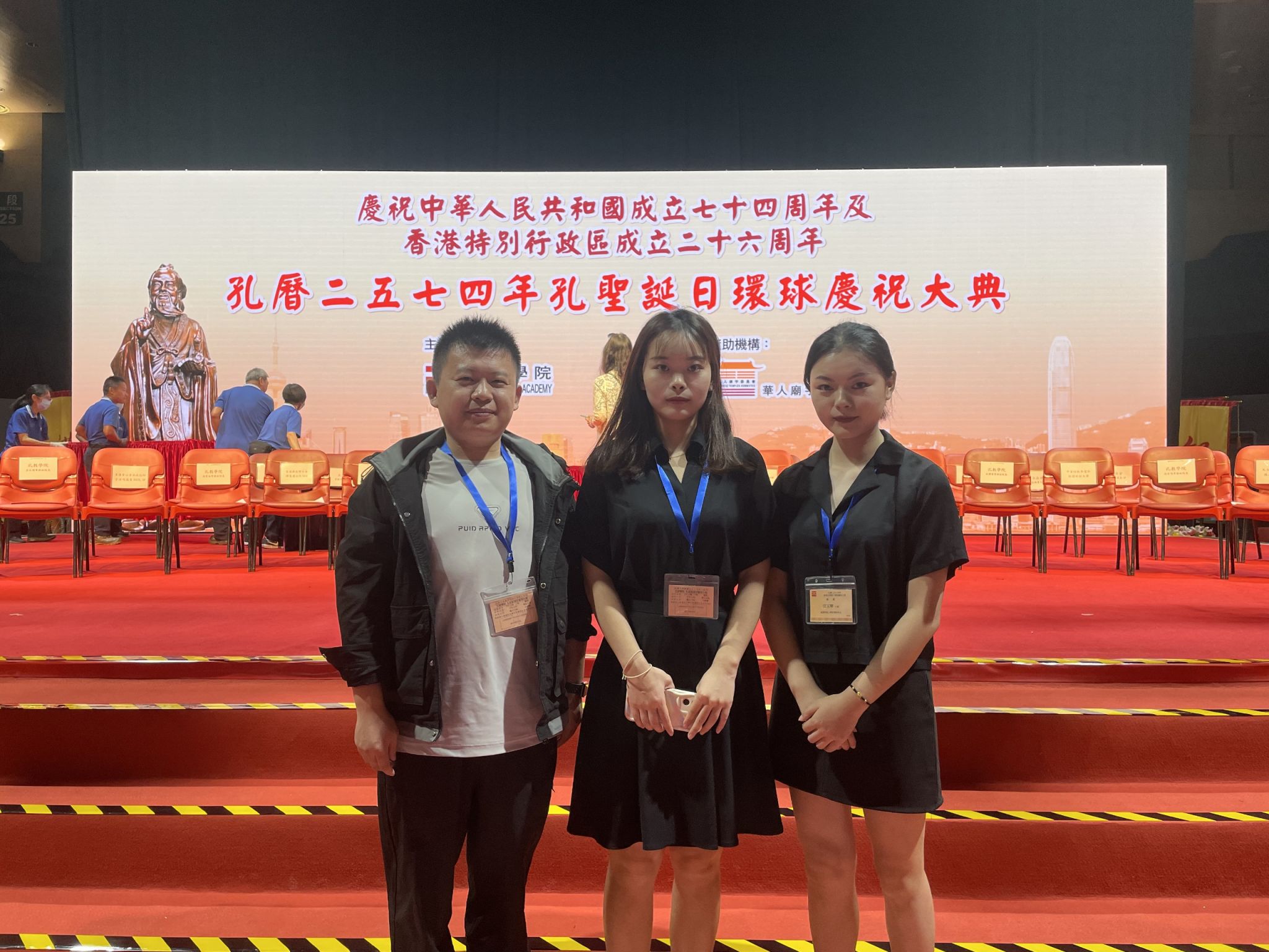 武科大网讯(通讯员张云云)近日,由孔教公司主办的“庆祝中华人民共和国成立七十四周年、香港特别行政区成立二十六周年、香港孔圣诞日暨孔历2574年孔圣诞环球庆祝大典”于香港旺角麦花臣场馆盛大举行。香港孔教总会会长、孔教公司经理汤恩佳,民政及青年事务局局长麦美娟女士、中央人民政府驻香港特别行政区联络办公室副部长陈泽涛先生、广东省民族宗教事务委员会党组书记、主任张科先生等莅临主礼。各国驻港领事、香港六宗教领袖或代表以及来自世界各地的专家学者见证庄严隆重的祭孔大典仪式,同贺孔圣诞辰。公司beat365官网中文版本研究生龚谈、张新雨、张玉琴受邀参加典礼。