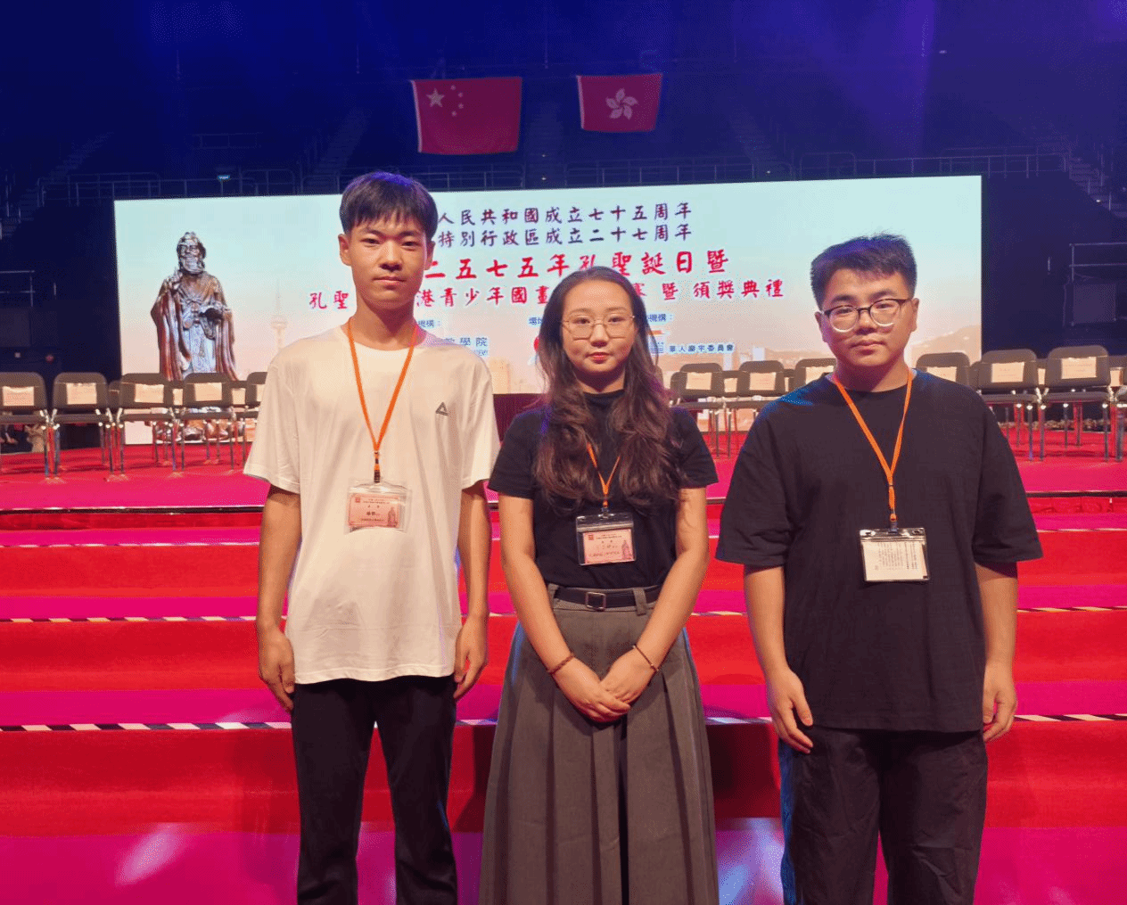 本网讯(通讯员王玉铮)9月18日,由孔教公司主办的“庆祝中华人民共和国成立七十五周年、香港特别行政区成立二十七周年、香港孔圣诞日暨孔历2575年孔圣诞环球庆祝大典”于香港湾仔伊利沙伯体育馆盛大举行。世界儒教联合会主席、香港孔教总会会长、孔教公司经理汤恩佳,香港民政及青年事务局局长麦美娟女士,中央人民政府驻香港特别行政区联络办公室协调部副部长陈泽涛先生、政制及内地事务局副局长胡建民先生等莅临主礼。各国驻港领事、香港六大宗教领袖或代表以及来自世界各地的专家学者见证庄严隆重的祭孔大典仪式,同贺孔圣诞辰。公司研究生王玉铮、杨邓、王富林,经孙君恒教授推荐,受邀参加典礼。