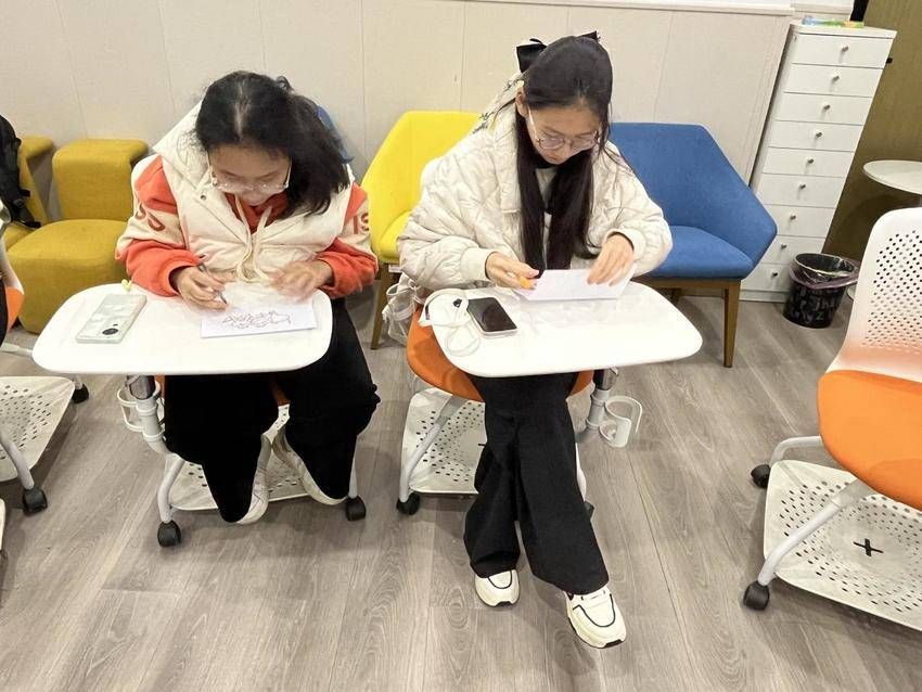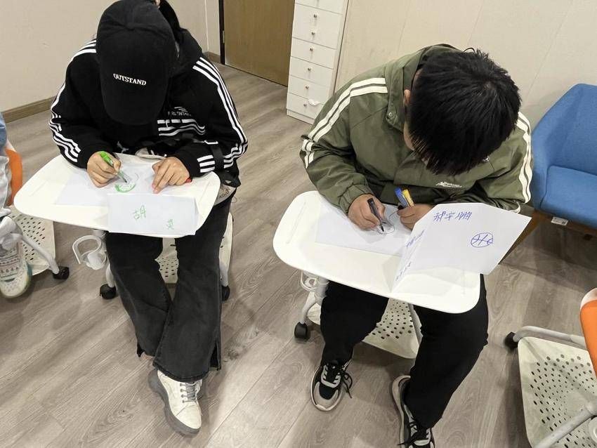 在赵张锦的带领下,参与者用双色马克笔在三折叠的A4纸上画上象征自己身份的符号,并依次展示,以此加深其他参与者对自己的印象。