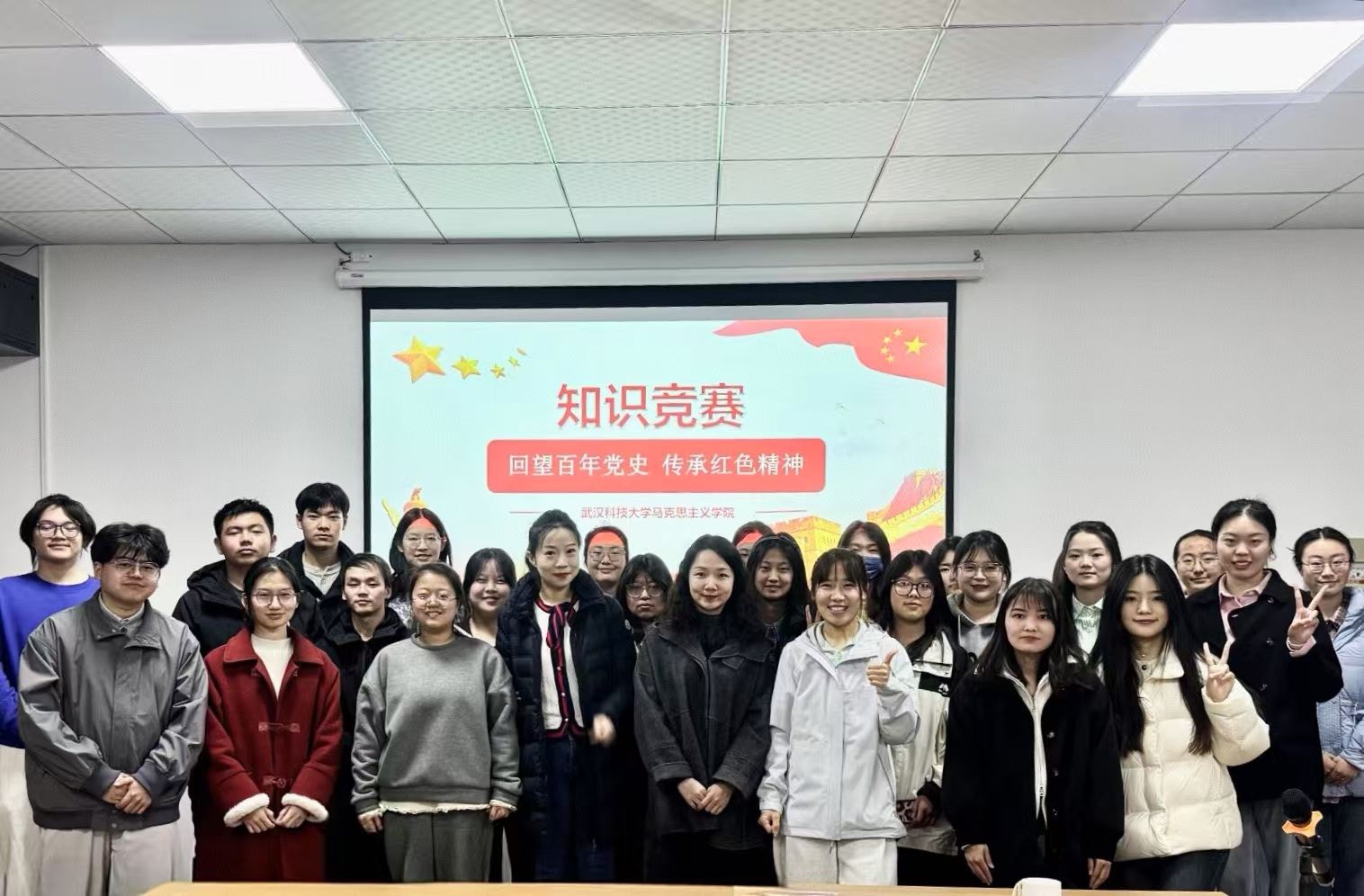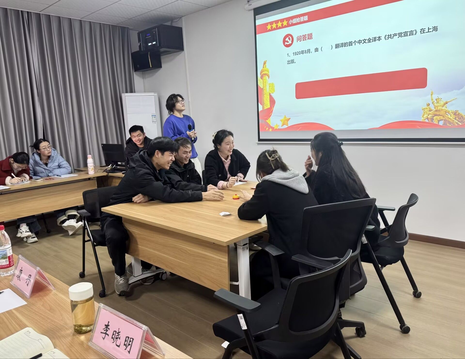 本网讯(通讯员江哲)为深入学习贯彻党的二十大、二十届三中全会精神,推动党史学习教育常态化长效化,引导青年学子厚植家国情怀、传承红色基因,3月18日晚上,公司“回望百年党史,传承红色精神”党史知识竞赛决赛在52405举行。经过院级初赛层层选拔,6支队伍脱颖而出,本科生与研究生同台竞技,现场气氛热烈,精彩纷呈。马克思主义理论系副主任康丹老师、2024级马克思主义理论班班主任陈希老师、辅导员李晓明老师参加活动,50余名师生齐聚现场,为选手助威。