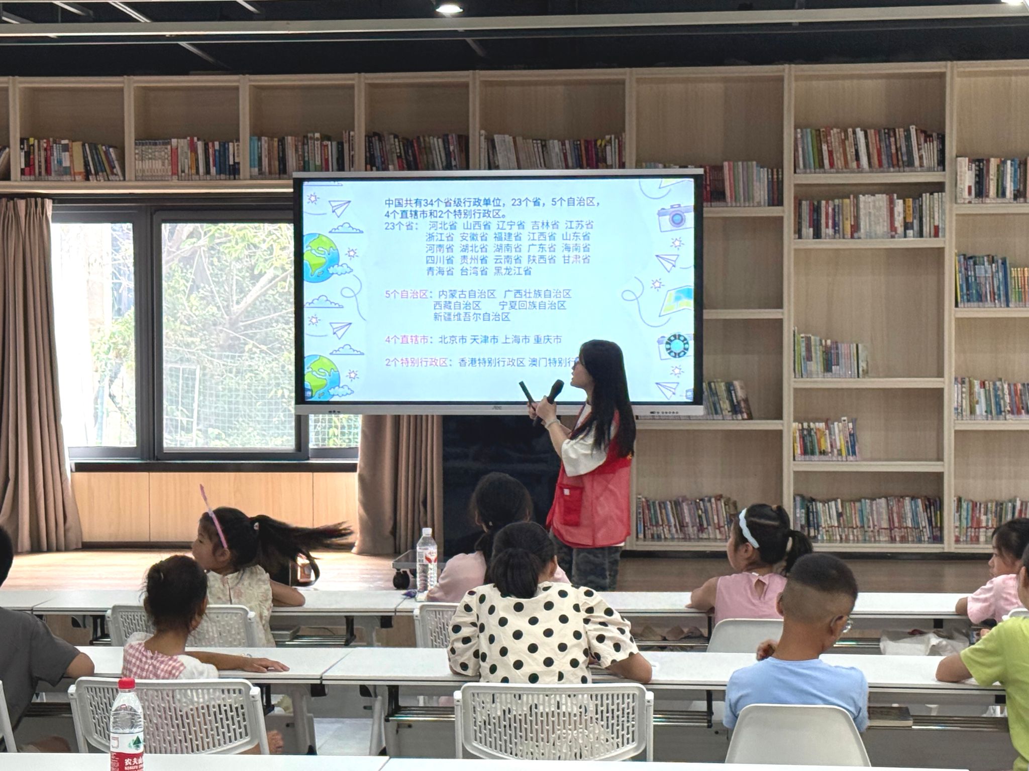 随后,“省份探险家”环节由志愿者崔思妍带领孩子们展开。她系统介绍了我国34个省级行政区的构成(23个省、5个自治区、4个直辖市、2个特别行政区),激发了孩子们对广袤国土的好奇。贾雨晨小朋友主动请缨,清晰流畅地为小伙伴们朗读了所有省级行政区的名称,展现了良好的学习热情。在紧张刺激的提问环节,孩子们的表现令人惊喜:贾雨鑫小朋友沉着应对,准确回答出关于省份知识的四道问题;钟亦文小朋友在同伴的鼓励和提示下,成功答出了五个少数民族自治区的名称,现场掌声不断。
